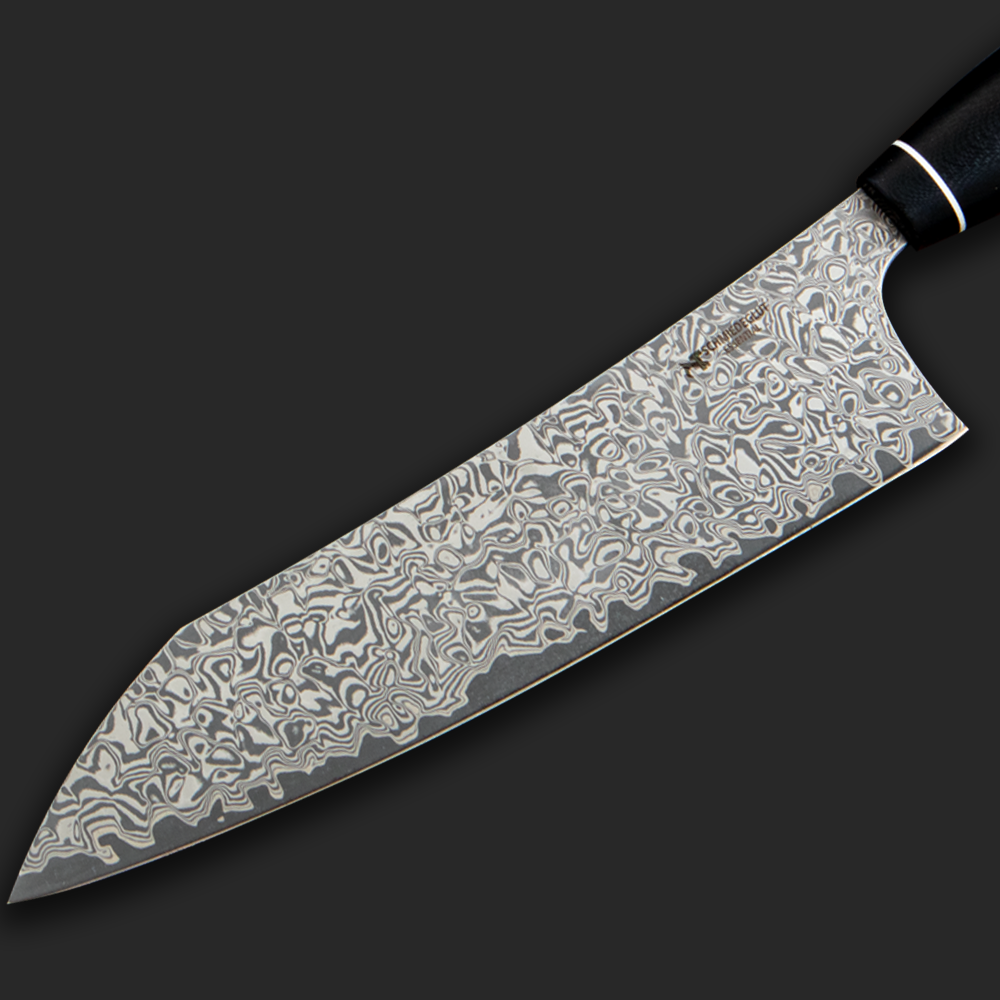 Rostfreier Damast Stahl mit 61 HRC Rockwell harter Schneidlage aus VG 10. Der perfekt ergonomische Griff (übernommen von unseren handgeschmiedeten Masterpiece Messern) schmiegt sich beim Arbeiten optimal in jede Hand.